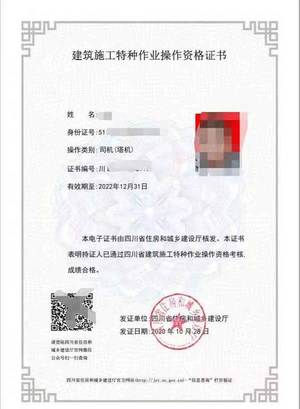 四川省住房和城鄉建設廳特種作業操作證;建筑電工,建筑架子工,建筑架子工(附著升降腳手架,)建筑起重司索信號工,建筑起重司機(塔式起重機),建筑起重安裝拆卸工(塔式起重機)建筑起重機械司機(施工升降機),建筑起重安裝拆卸工(施工升降機),建筑起重機械司機(物料提升機),建筑起重安裝拆卸工(物料提升機),高空作業吊籃安裝拆卸工(審證-兩年審一次)