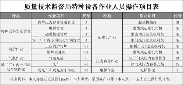 叉車證-全國叉車上牌,電梯維修,特種安全設備管理,起重機指揮,起重司機(限門座式起重機),起重司機(限橋式起重機),起重司機(限門式起重機),起重司機(限纜索式起重機),起重司機(限塔式起重機)起重司機(限流動式起重機)起重司機(限升降機),觀光和觀光列出司機,鍋爐壓力容器壓力管道管理,電梯管理,起重機械管理,場(廠)內專用機動車輛管理,工業鍋爐司爐,電站鍋爐司爐,鍋爐水處理,快開門式壓力容器操作,移動式壓力容器充裝,氣瓶充裝,金屬焊接操作-壓力焊PE焊,非金屬焊接操作-壓力容器焊,食品檢驗員,化學檢驗員,農產品檢驗員(4年一審,需要到期前3個月進行)
